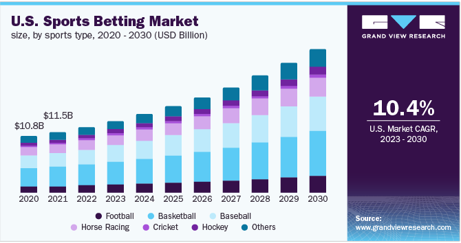Projected growth for the US Sports Betting market is estimated to be 10.4% through 2030 … we guess something had to outpace inflation.